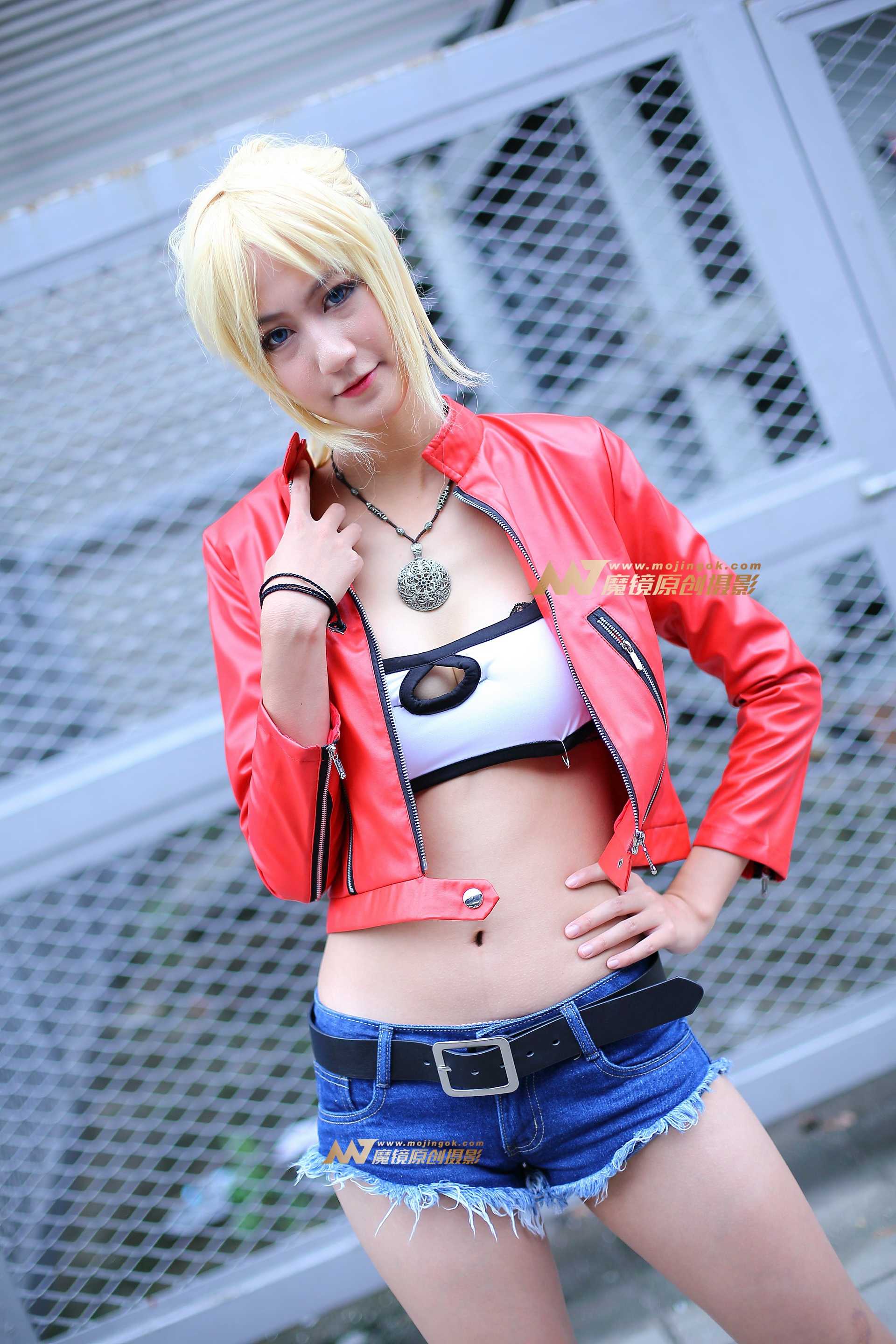 红色皮夹克白抹胸长腿cosplay